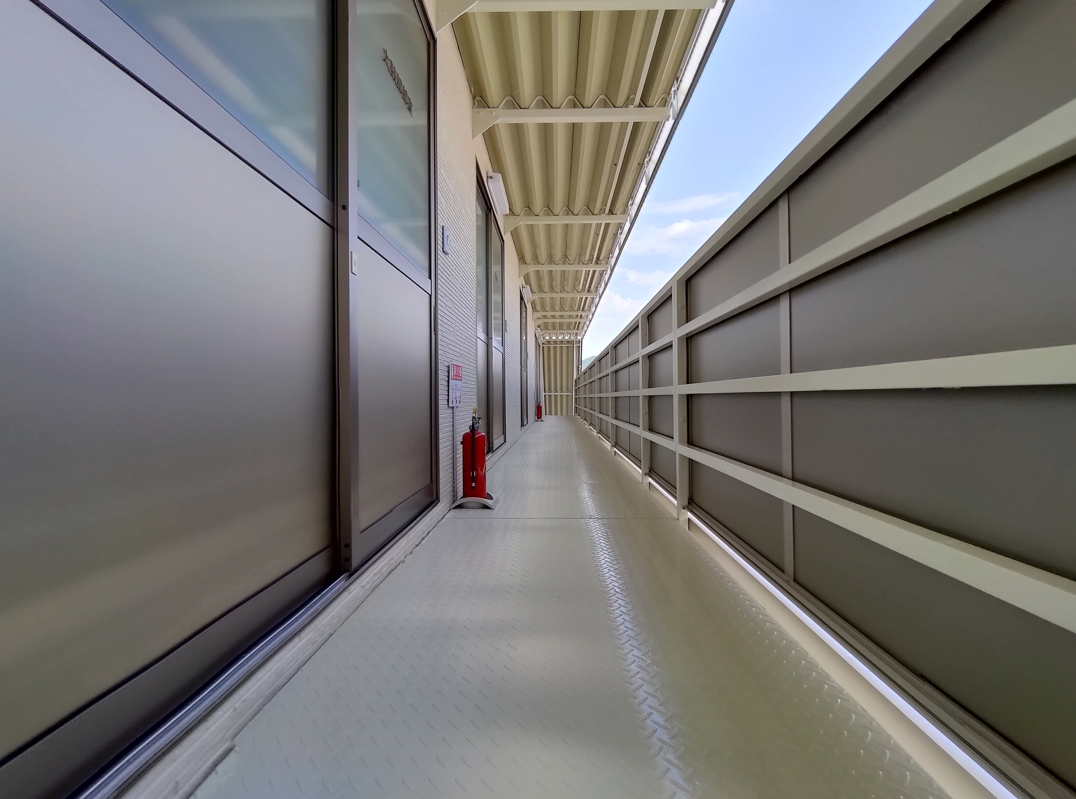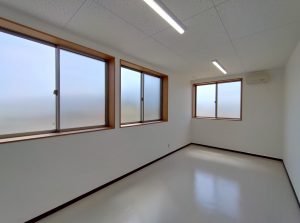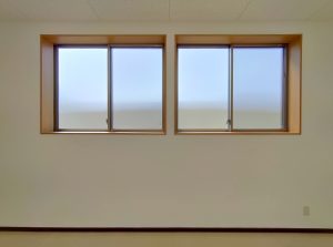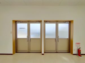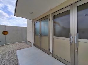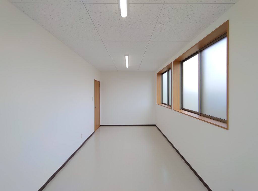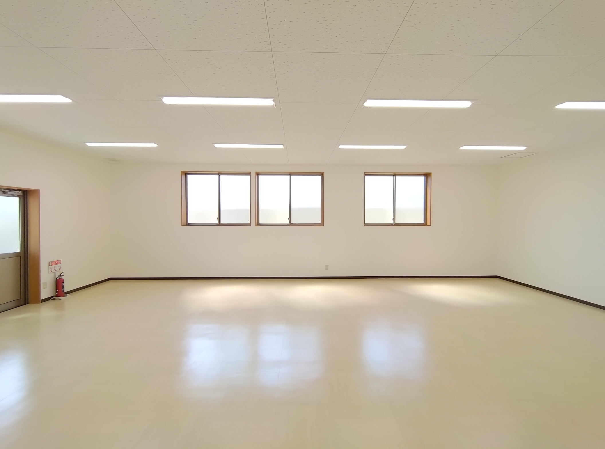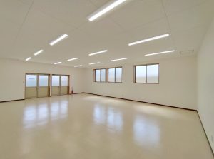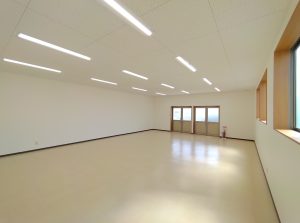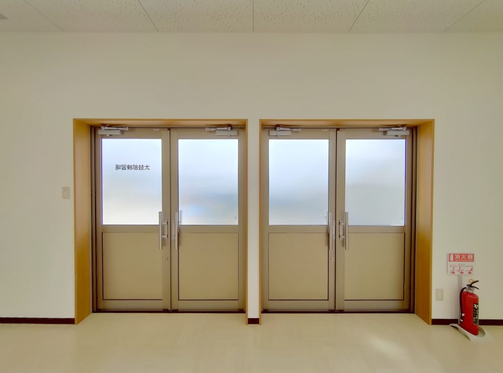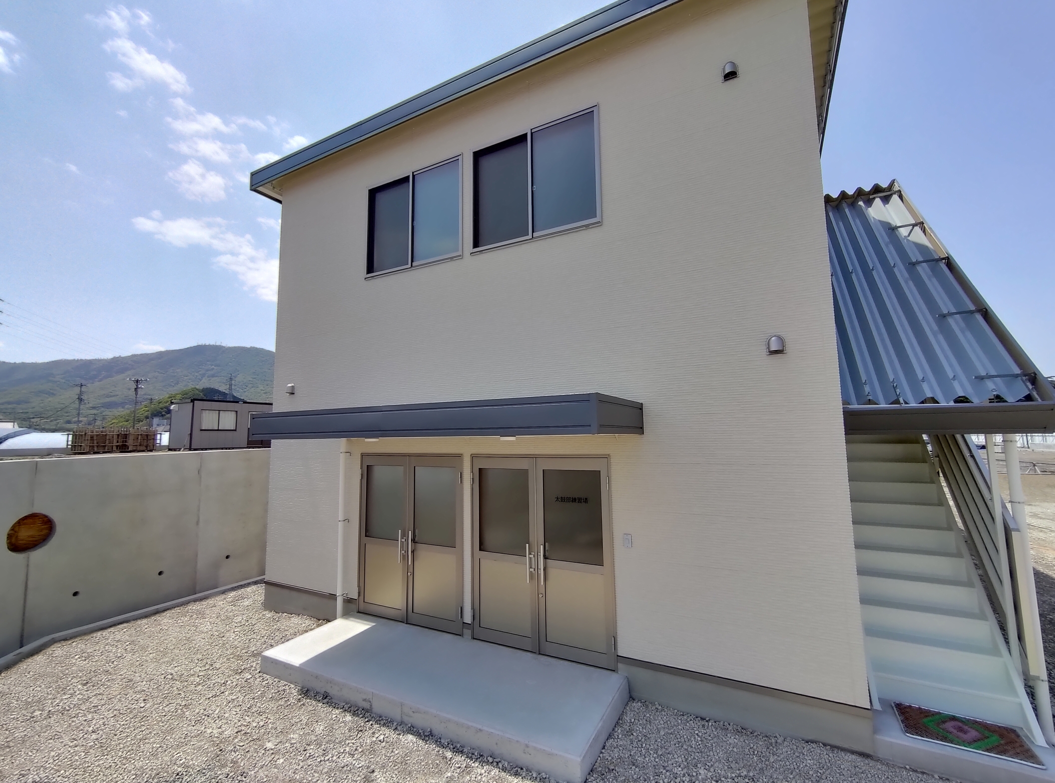高等学校に併設された生徒のためのクラブハウス。様々な部が入居していますが、1階には太鼓部の練習場を配置。大きな太鼓は、高さが1.6m・バチの長さも60cmから90cm近くにもなり、そのため初期の設計であった天井高を2.5mから2.9mに変更。窓や出入り口には強化ペアガラスを使用し、音漏れと断熱性に最大限配慮。2Fには動線とアクセスの容易さを考慮し両サイドに階段を配置。日々の練習で、世界に羽ばたいてください。
