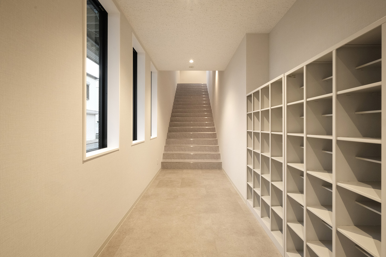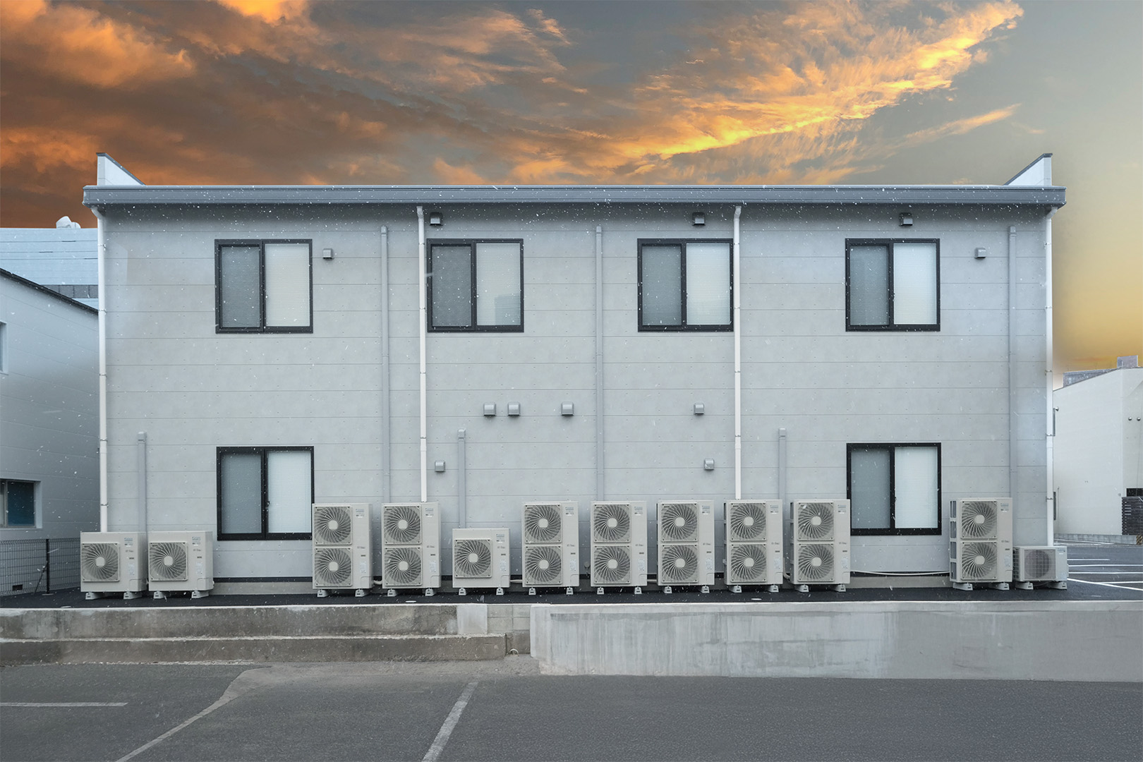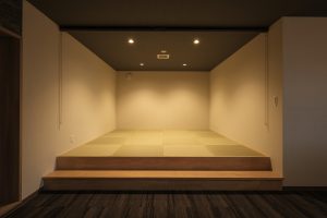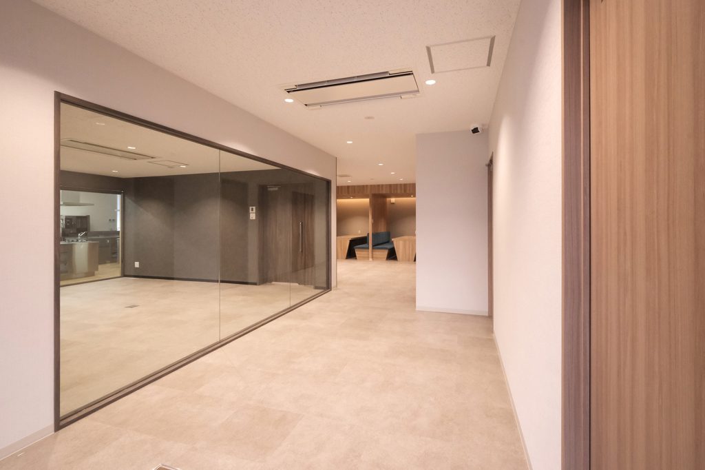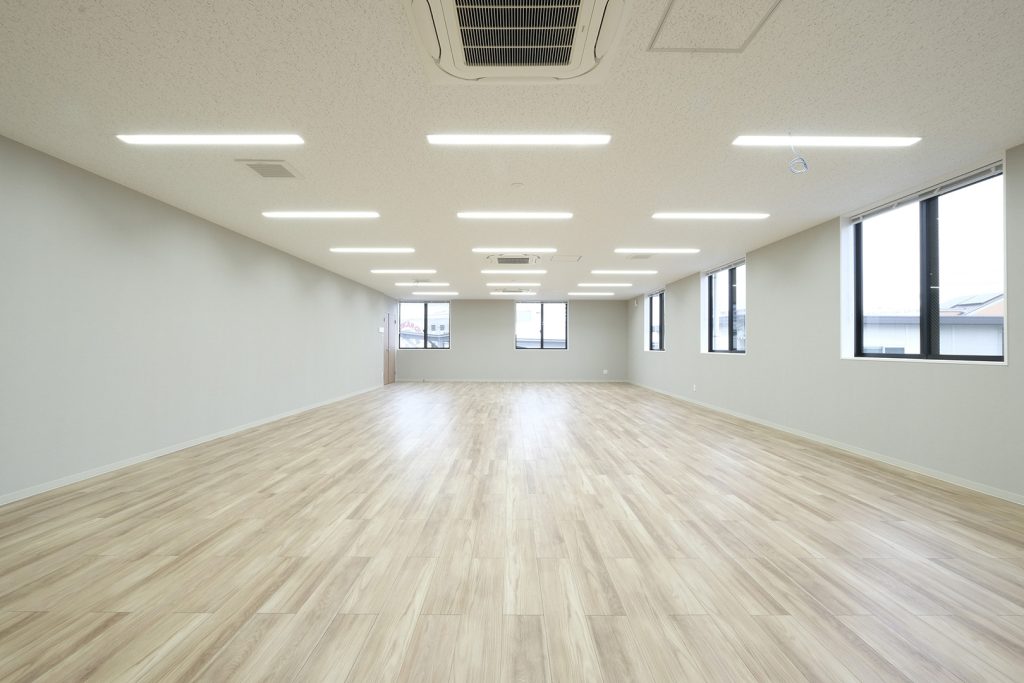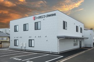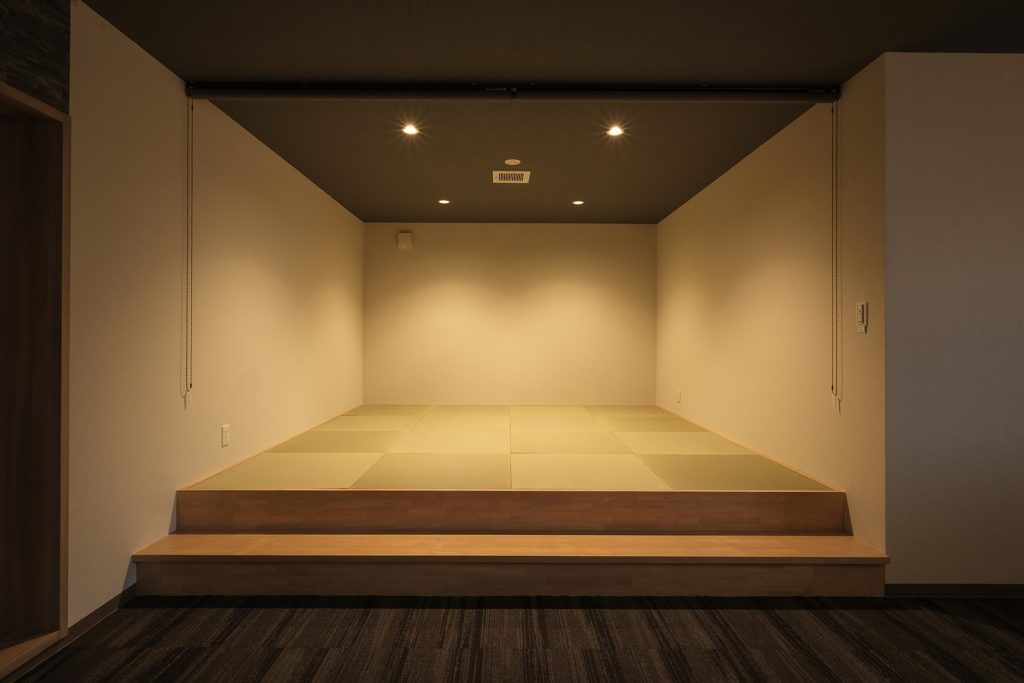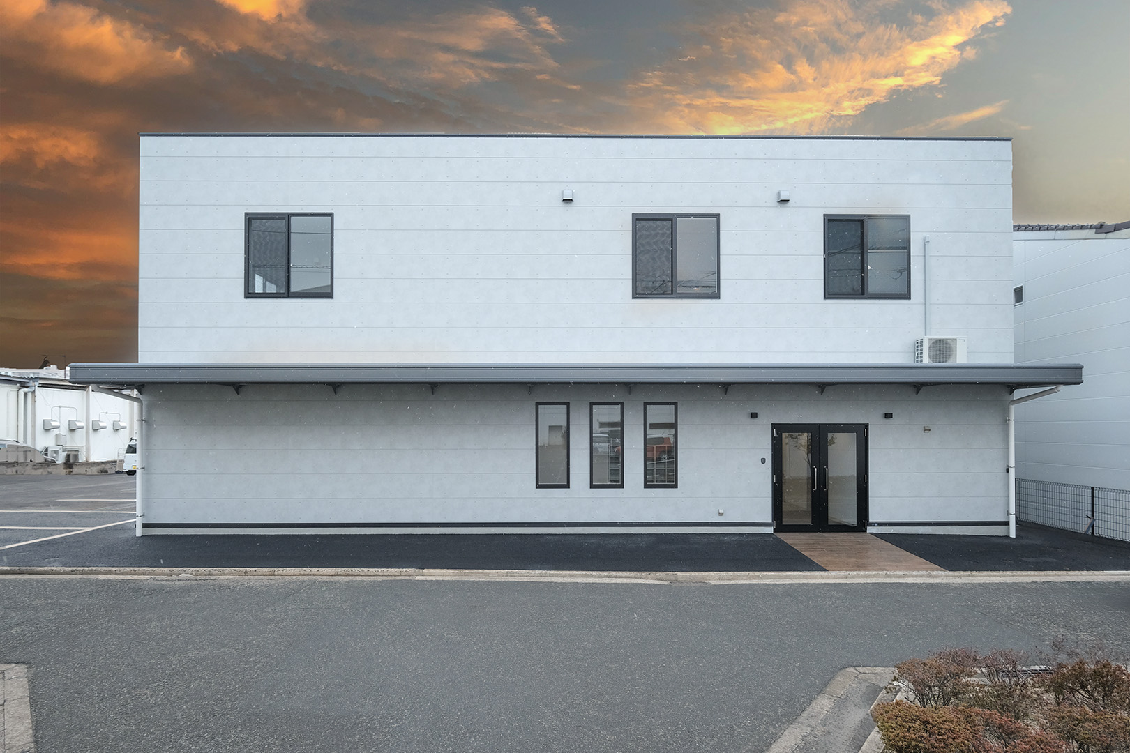 WDシリーズ 「WDシリーズ」 オリエントハウスのプレハブシリーズで、TDシリーズをベースに木製の外壁下地を使用したモデルです。シリーズ詳細はこちら>more で設計・施工した事務所です。以前事務所を建設させていただいた食品メーカー様より、商品開発や試食会を行うための新たな施設建設のご相談をいただきました。1階には調理室と隣接する形で商談室を配置しており、新商品を試食しながらスムーズに商談が行えるよう計画されています。2階には、試食会の開催を想定し、リラクゼーションスペースや畳コーナーを設けました。設計にあたっては、試食会のための食器類を収納するパントリーのスペースを最大限に確保するため、階段の位置や段数を調整。さらに壁の配置を工夫することで、柱やブレースを建物内部に露出させることなく、大規模な会議室の設置を実現しました。外観デザインでは、1階と2階の窓の位置・高さを揃え、全体に統一感を持たせています。外壁には打ち放しコンクリートの質感を再現したサイディングを採用し、モダンで洗練された雰囲気を演出しました。