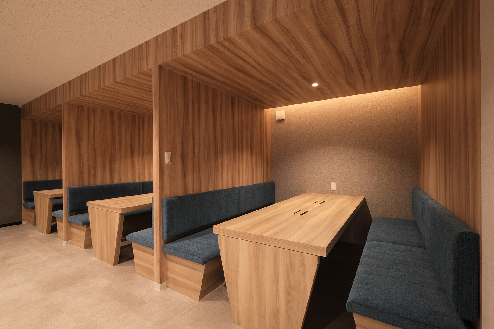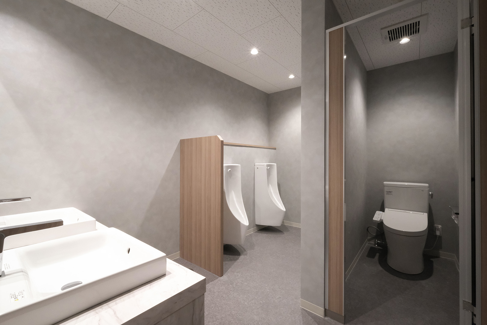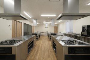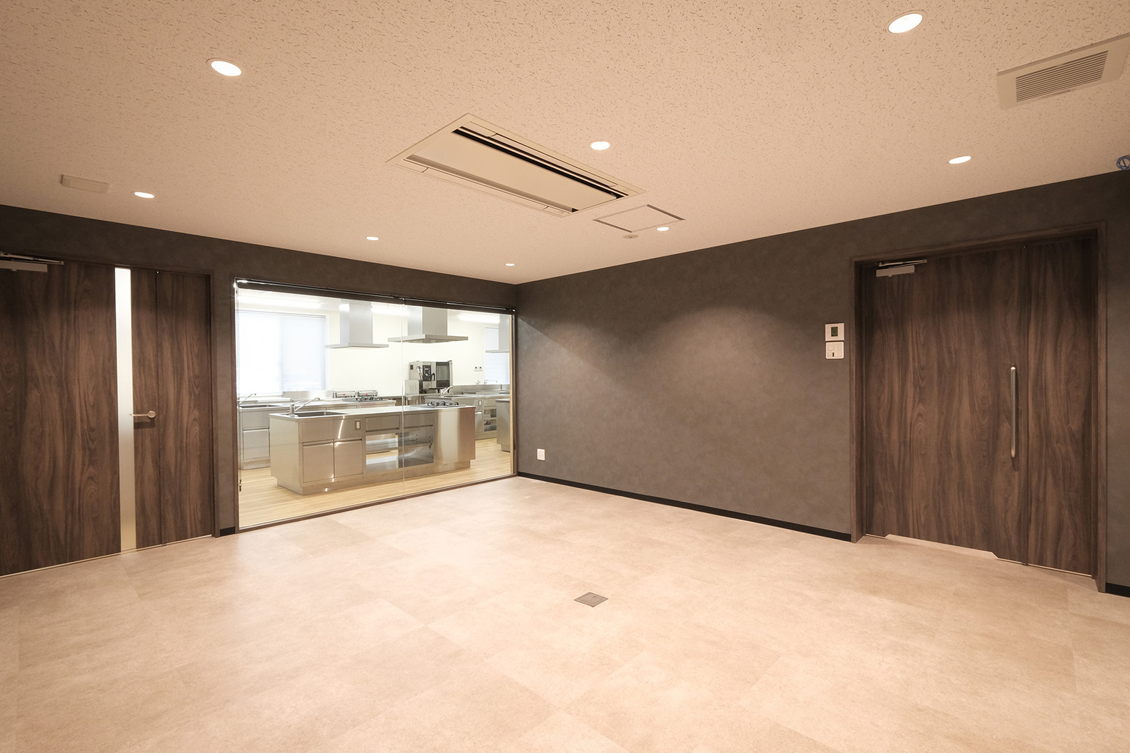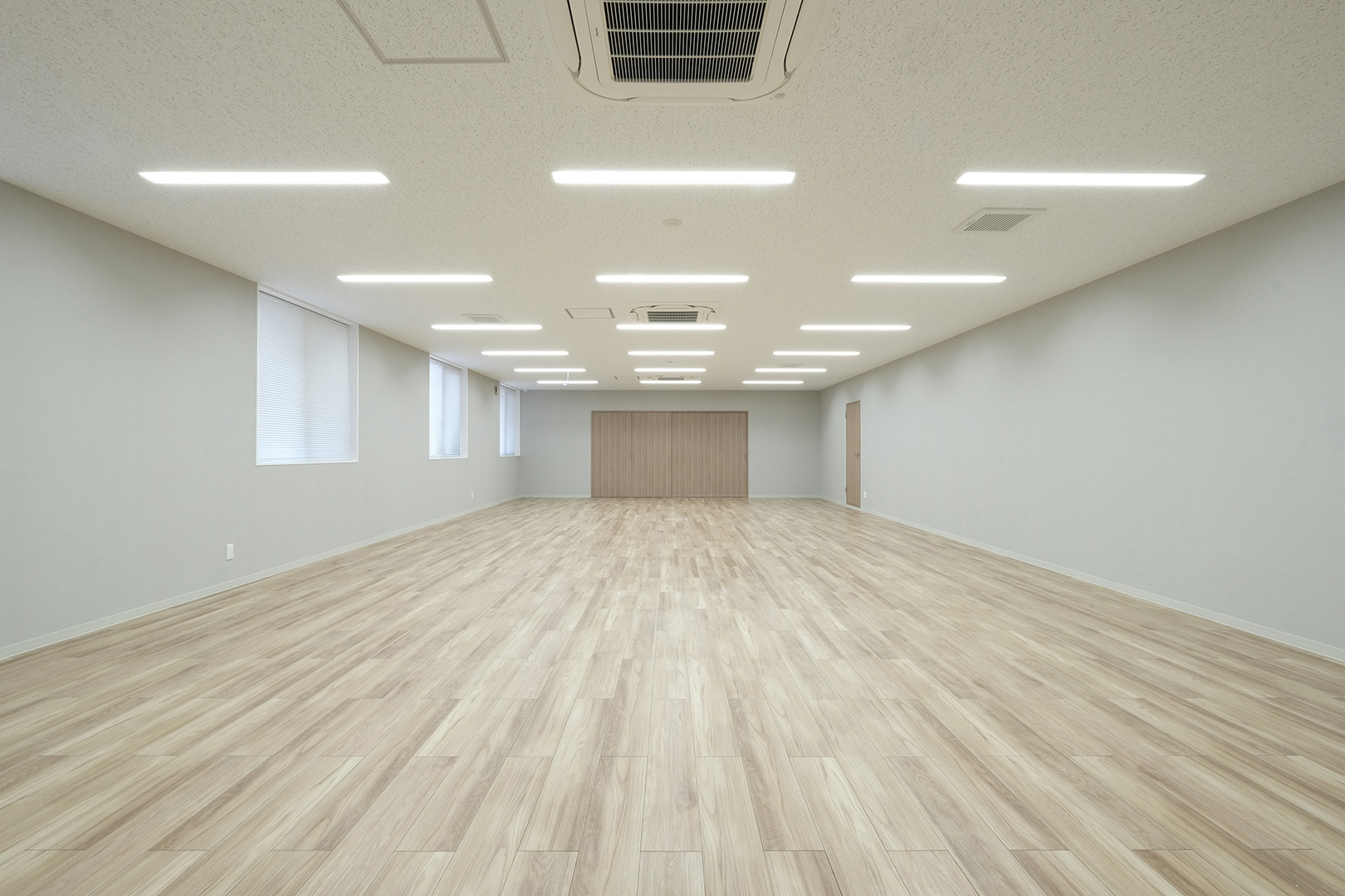 WDシリーズ 「WDシリーズ」 オリエントハウスのプレハブシリーズで、TDシリーズをベースに木製の外壁下地を使用したモデルです。シリーズ詳細はこちら>more で設計・施工した事務所です。以前事務所を建設させていただいた食品メーカー様より、商品開発や試食会を行うための新たな施設建設のご相談をいただきました。1階には調理室と隣接する形で商談室を配置しており、新商品を試食しながらスムーズに商談が行えるよう計画されています。2階には、試食会の開催を想定し、リラクゼーションスペースや畳コーナーを設けました。設計にあたっては、試食会のための食器類を収納するパントリーのスペースを最大限に確保するため、階段の位置や段数を調整。さらに壁の配置を工夫することで、柱やブレースを建物内部に露出させることなく、大規模な会議室の設置を実現しました。外観デザインでは、1階と2階の窓の位置・高さを揃え、全体に統一感を持たせています。外壁には打ち放しコンクリートの質感を再現したサイディングを採用し、モダンで洗練された雰囲気を演出しました。